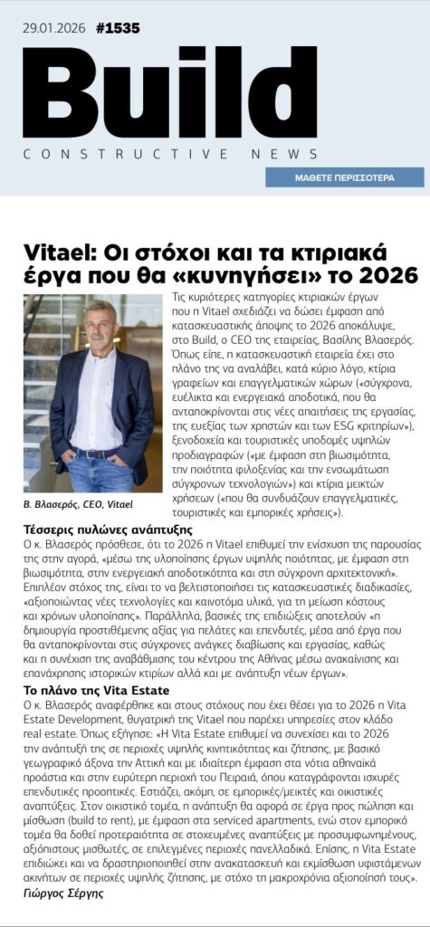 Η VITAEL A.E. συστάθηκε το 2009 με κύριες δραστηριότητες την Υλοποίηση Κατασκευαστικών ‘Εργων (construction contracts), καθώς και την Διοίκηση Έργων (Design & Construction Management). Επίσης, πεδία δραστηριοποίησης αποτελούν η Ανάπτυξη Ακίνητης Περιουσίας (Real Estate Development), καθώς και η Διαχείριση Ακινήτων (Property Management), μέσω της εταιρίας μας Vita Estate Development